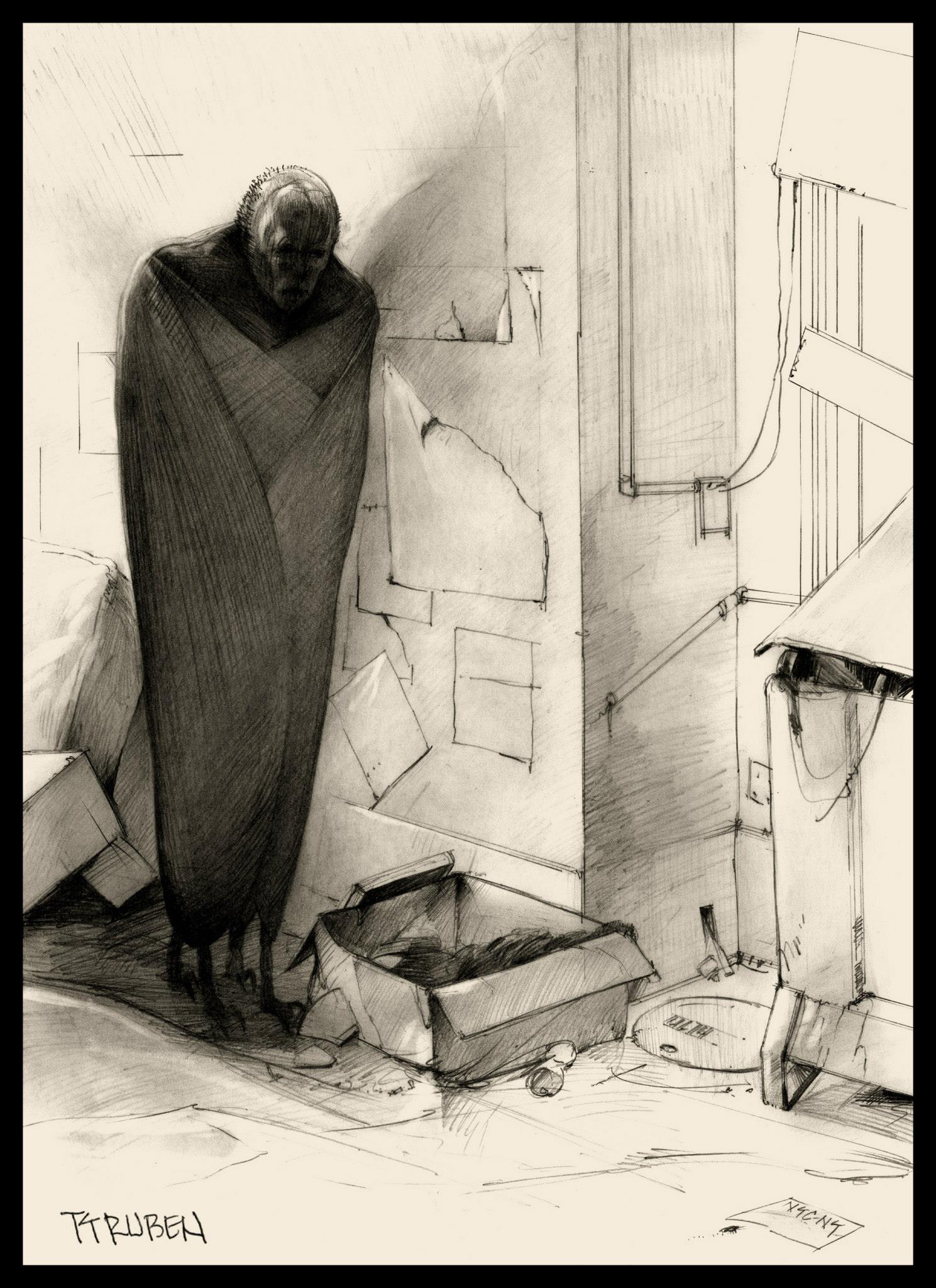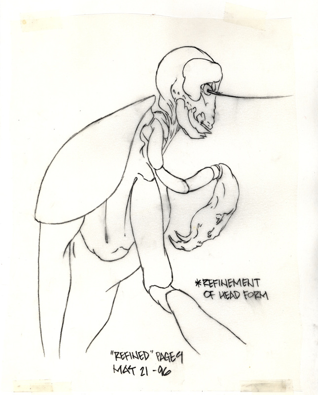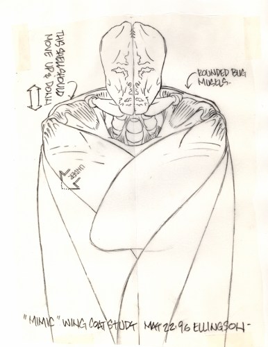 “In this sketch,” Ellingson commented, “you can make out the early ‘head with brimmed hat’ idea that we moved away from shortly after I got involved. If I remember correctly, it had to do with who actually wore brimmed hats, and what kind of statement that might make to the viewer. As the Mimic was to be perceived as a derelict of sorts — a homeless person — the idea of a small tight fitting hat, or hood, quickly got traction after I shared my first few drawings with GDT.”