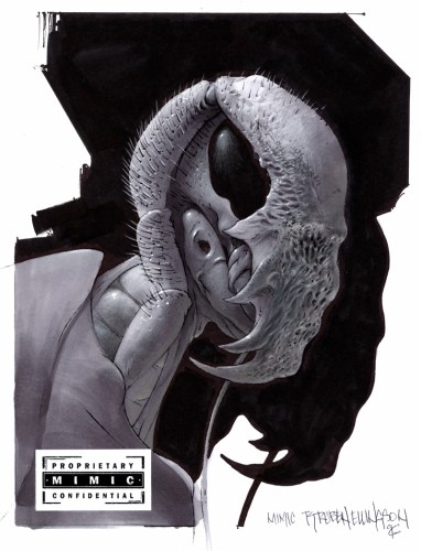 Following the idea, Ellingson produced a new concept illustration. In reviewing it, Del Toro and Ellingson decided that the ‘faux face mandibles’ would actually cover the Mimic’s head rather than just being held in pose in front of it — an idea they called the “peek-a-boo mandibles”. Ellingson related: “Guillermo and I came around to the idea that it would be much scarier if the faux face mandibles could — rather than just being held up in the air — actually ‘cover up’ the insect’s face. Once accomplished, when the creature was set to attack, this reveal of its biting jaws would be fast and unexpected — the movement similar to that of what a parent does with a child when playing peek-a-boo.”
