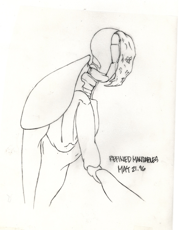 Another key design element was inspired by mantises: a switchblade-like tarsus that could be folded into the arm — concealed by a human hand-like protrusion of the tibia — and deployed at will to stab and cut.