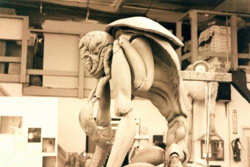The original Mimic design was translated into a reference maquette. All design elements were maintained: the shell-like structure became a crown protruding from the top of the Mimic’s actual head. Spots of varying tones (unseen in the mostly unpainted maquette) created the illusion of facial features — a trait recalling the description in the short story. The large upper head was covered by a membrane resembling the hood of a jacket.