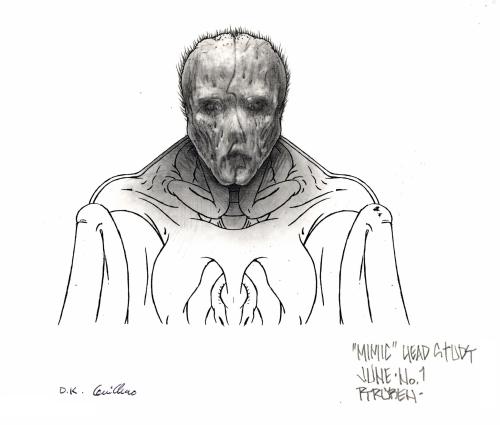 The two pieces below are side view studies, already close to the final incarnation of the ‘Long John’ Mimic design; they show how the creatures’ peculiar ‘mask-claws’ function and how the Mimics’ appearance changes when they are in ‘masked’ and ‘unmasked’ positions. Notice that the ‘mask-claws’ here were successively changed for the adult monsters. The juveniles mantain the earlier design due to the fact that when the decision was made, the practical models for the character were already built and ready for filming.