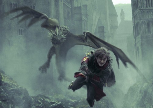 In the novel, the first task ends in the arena; in the film, however, the sequence was taken into a more action-oriented direction: the Horntail breaks from its restraints, chasing Harry outside the arena. Visual effects supervisor Jim Mitchell developed the idea. He related: “There never was any of the chase around Hogwarts castle, but one day when I was checking out the huge physical model of the castle for some establishing shots, I thought how cool would it be to see Harry and the dragon flying through its deep ravines, under bridges and past these giant, stoned structures. I imagined the dragon landing on one of the steep towers and roaring like King Kong on the Empire State Building. Mike Newell and the producers liked the idea and so the sequence grew to include the chase.  I think it opened the sequence up and made it more perilous and exciting than it originally was.” The chase scene offered the opportunity to further showcase Horntail animation — swooping like a hawk or crawling like a bat on the Hogwarts towers.