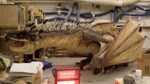 The skin of the creature was painted by Kate Hill and Waldo Mason. The thorns on the Dragon’s head, neck and back were moulded in coloured resin, and were of six different sizes; a total of 200-300 (including ‘backup’ thorns) were made. The larger spikes were reinforced with fiberglass matting. Each thorn was individually hand-finished, and painted once put in place on the Dragon.
