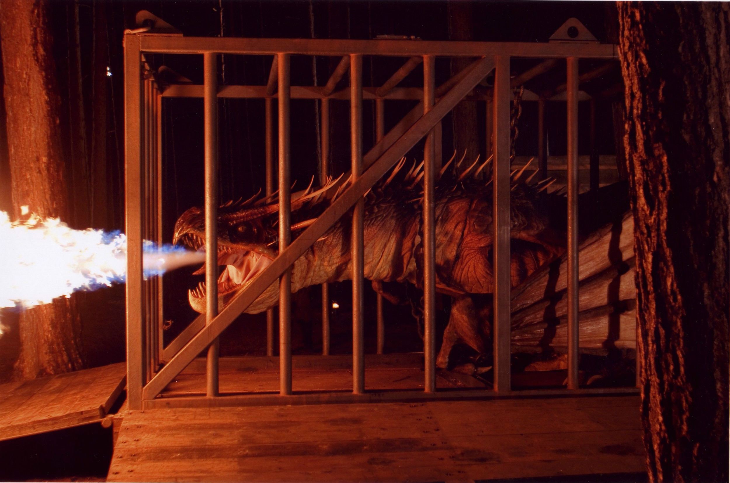 The finished animatronic was mounted on a mobile, wheeled unit — which eased transport of the enormous prop. The head could perform a wide range of motion, including an articulated neck and mouth, and movable eyes, eyelids and nostrils. The wings could make limited movements and the body could move from side to side. The puppet was shot inside a hydraulically-operated breakaway cage. In addition, the full-size Horntail was also used at the film’s world premiere in London.