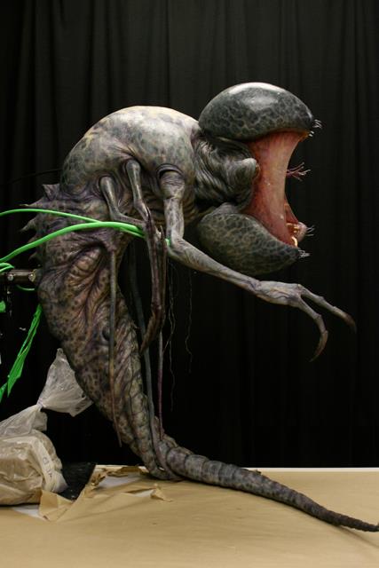 The ‘Giger’ Alien Beast was designed by David Leroy Anderson and Michael Broom. Early artistic incarnations of the monster conceived a suit performer with the lower half of their body covered in green clothing to be erased in post-production, whereas others had the performer hanging from a platform. Those ideas were discarded, and the monster was finally created as an animatronic rod puppet, sustained by three puppeteers and a harness. Sculpted by Hiroshi Katagiri, it featured articulated eyes and pupils, mandibles, fingers and various appendages. It was also able to turn articulated tentacles outward from its mouth opening. The puppeteers wore greenscreen outfits, and the supporting rods were painted green, in order to be removed in post-production; this technique achieved the desired hanging stance or floating movement of the character. A brief sequence introducing the Alien was in the script of the film; it was filmed [see picture above] but ultimately discarded for the final cut of The Cabin in the Woods, where the Alien was replaced by the Wraith.