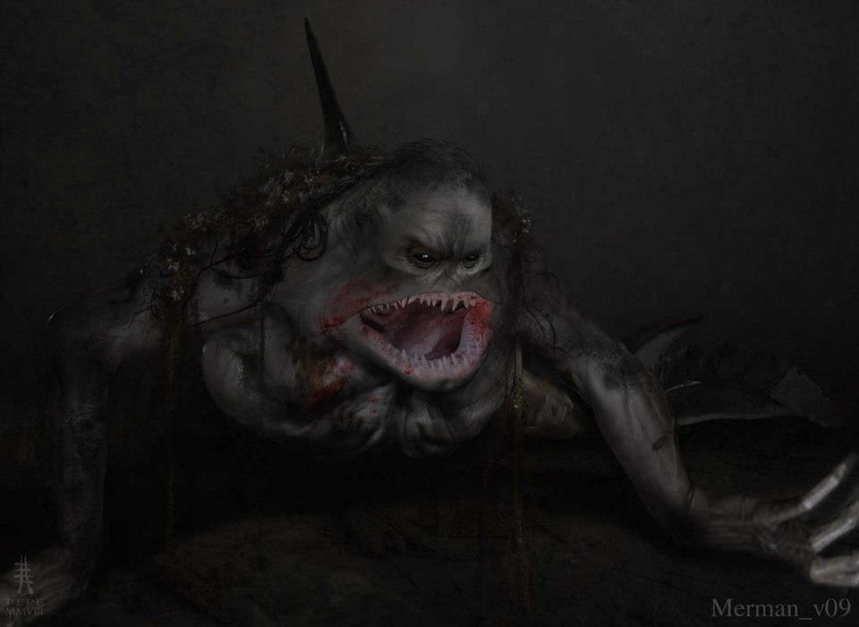 Earlier designs for the Merman were heavily influenced by the Gillman in The Creature from the Black Lagoon. The monster would, however, progressively lean towards a legless, more fish-like configuration. The final Merman was designed by Joe Pepe. His concepts were photoshop collages obtained from high-resolution photographs of various elements, including shark jaws, humanoid foreheads and long hair.
