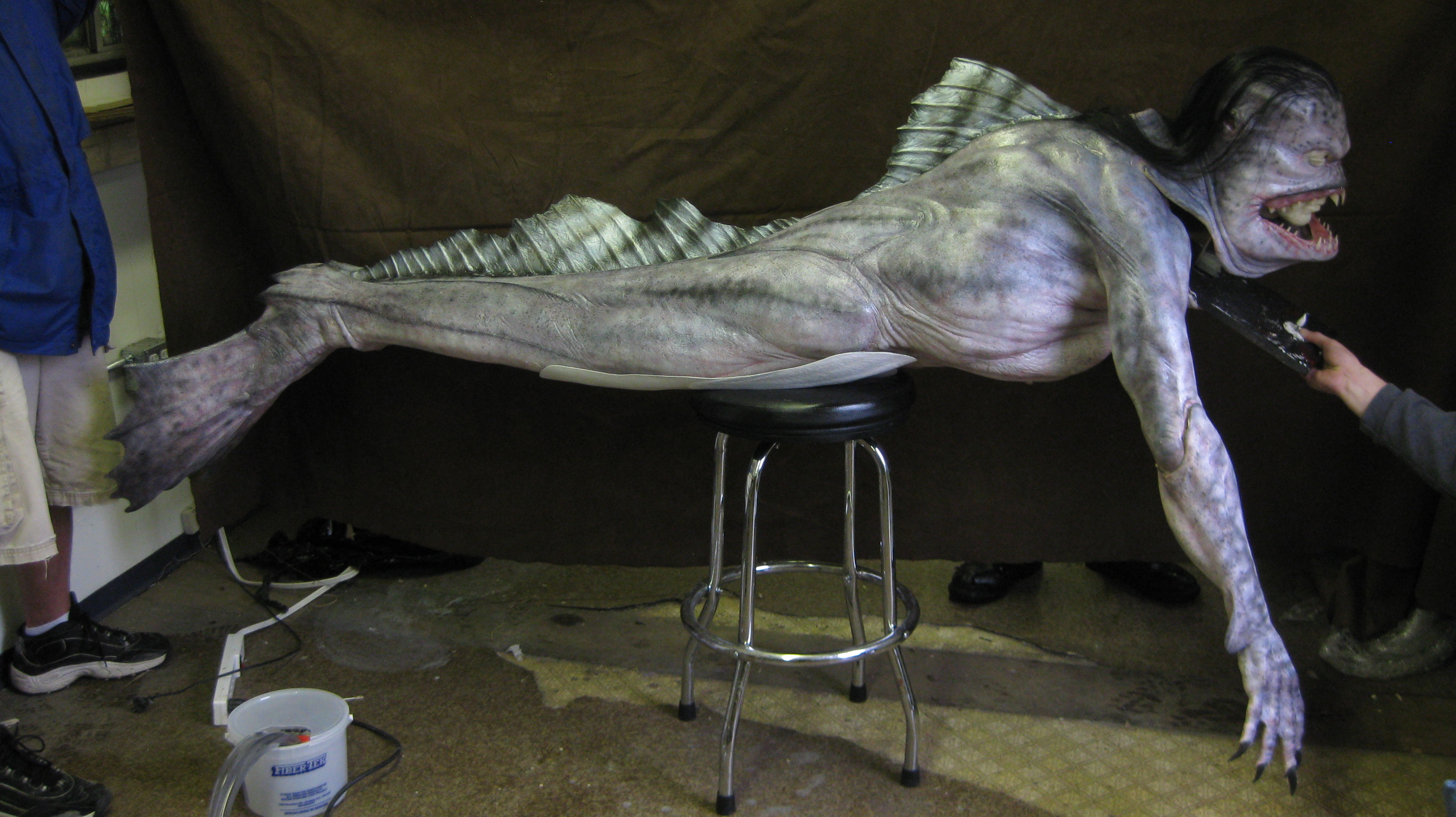 The Merman was brought to the screen as a creature suit, performed by Rich Cetrone. The suit was composed of two main parts: the body and the upper jaw, which was attached to the actor’s forehead. The lower part of his head would be seen inside the monster’s mouth; the problem was solved with a green mask. David Anderson explained: “when the Merman opens his mouth, what was there on the day of filming was the lower half of Rich Cetrone’s face, under the roof of the Merman’s mouth. When the Merman’s mouth opened, there was Rich’s chin and the bottom of his nose. Visual effects had to erase all that and illustrate the interior of the mouth. So Rich wore a green-screen cover over his chin It’s a foam rubber appliance over his whole forehead that blends off over his nose, which creates the upper lip.”