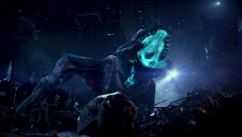 Leatherback (Category 4) is the gorilla-like Monster that attacks Hong Kong alongside Otachi, and the creature of the film del Toro relates to the most. “I really, really respond to him on a visceral level,” the director said. “He’s absolutely brutal but I find him kind of adorable.” Leatherback’s skin is armour-plated, and a specialized organ on its back produces a biological equivalent of an electromagnetic pulse (EMP). The twin crests on its head shift and move, revealing a writhing array of bioluminescent tentacles in the back of the head, which move more rapidly as the creature is stressed. Leatherback was designed by David Meng, “one of the best designers of monsters in the world,” according to del Toro. Meng also sculpted the maquette of the creature.