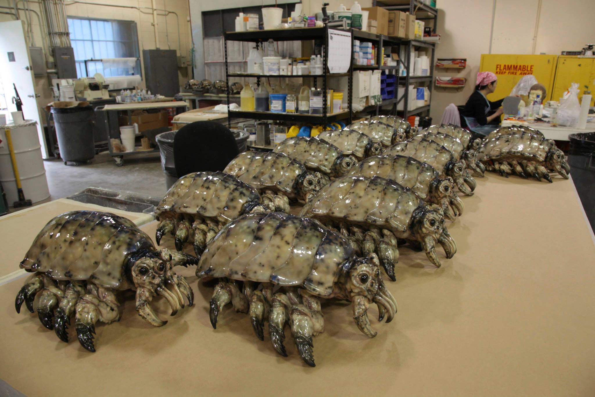 The Kaiju are also ‘plagued’ by parasites that live on the external layers of their skin. Practical construction of the creatures was assigned to Spectral Motion. The skin parasites, affectionately labeled as ‘Rollie-Pollies’ were designed by Mike Elizalde and Alex Palma. Inspiration for the design — and the name — came from isopods. Other crustaceans were also used as reference for texture and colour scheme. The parasites were built as full-size animatronics — sculpted by Joey Orosco and Mario Torres, and painted by Russ Lukich. The mechanics that allowed the arthropod-like movement were conceived and built by Mark Setrakian. Digital versions of the parasites can be seen crawling on Leatherback and other kaiju’s skin during the film.