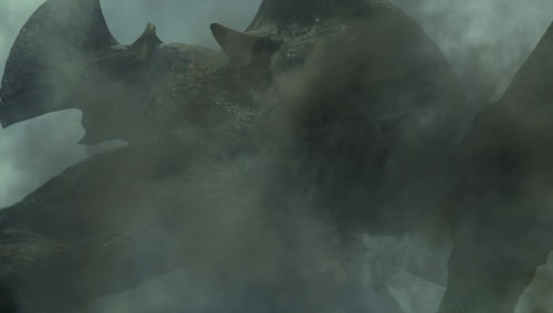 Two Monsters emerge from the breach and attack Hong Kong. Otachi (Category 4) is the name given to the flying creature, with a  reptilian head and two blade-like crests. “We designed the face to be really, really evil,” del Toro said. “It has a sort of evil intelligence to its eyes.” Otachi was mainly designed by Guy Davis, who based early sketches of the creature on a crawling bat. The protrusions on the creature’s head were inspired by the skull of a Brontotherium. Early iterations of the Monster featured jaw tendons, as well as multiple eyes on the sides of the head and a hammer-shaped tip of the tail.