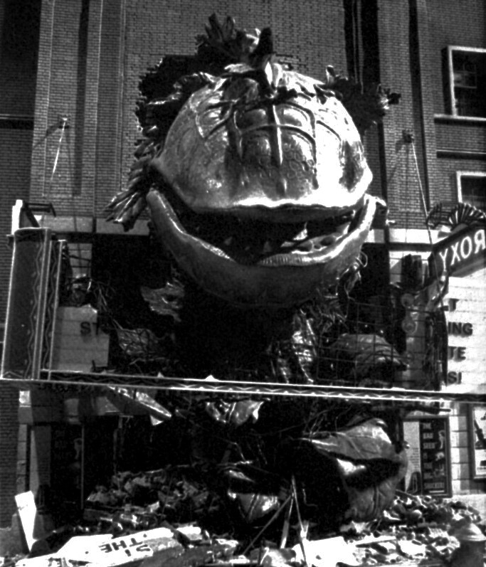 Martin’s plan is to produce and sell the plants on a global scale, to the point where “every household in America” could have one. Seymour looks at the plant, which smiles at him. The newborn Audrey II animatronic was reused for this sequence and slightly repainted to give the impression of a new individual. Seymour realizes the sheer scale of the threat and returns to the shop with the intent to finally destroy Audrey II. Martin reminds him that his consent for selling the plants is not necessary, “because a Goddamn Vegetable is public domain.”