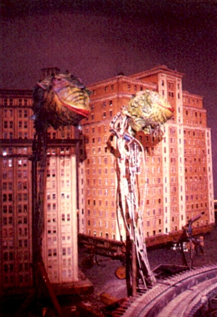 The puppets were filmed in differently-sized sets in order to present plants of different sizes, whilst still using the same models. Conway explained: “the scale of the plant was determined by the scale of the set we put it into. If we put it next to a twelfth scale set, the plant became twelfth scale. If we put it next to a thirty-second scale set — the Brooklyn bridge set, for example — then it became thirty-second scale. We were able to take it from twenty feet high to one hundred and twenty feet high using the same plant.” The plants were also filmed at different speeds, something that also enhanced the illusion of scale. “We shot from 48 frames per second to 360 frames per second to make it whatever size we decided it should be for a particular shot.”