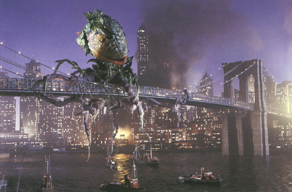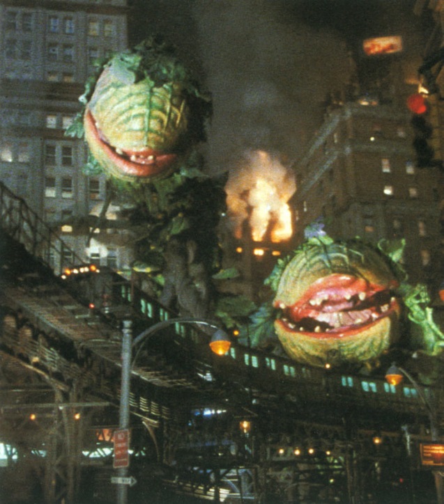 Seymour returns to the shop and tries to defeat the plant once and for all; Audrey II, after singing Mean Green Mother from outer Space, tears down the place and plucks him out of the ruins. As he screams in terror, he is slowly devoured alive by the plant. As narrated by Crystal, Ronette and Chiffon, spawns of Audrey II are produced and sold worldwide. The various owners, having been “sweet-talked into feeding them blood,” nourish the plants, unaware of the threat. The Monsters eventually grow to gargantuan sizes, wreaking havoc in major cities (such as New York) and consuming whatever comes in their way, as a choir sings the final song of the film: Don’t Feed the Plants.