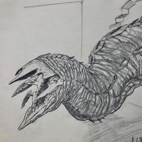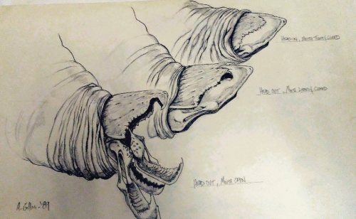 Gillis added: “I did this sketch based on a snapping turtle. Snapping turtles can retract their heads into a mass of protective flesh. This sketch shows how that might look. I asked mega producer Gale Anne Hurd what she thought of my sketch. In her inimitable fashion she said ‘I showed it to the women in my office and we all agree that we aren’t making a movie about giant penises chasing people around the desert.’ I laughed. She didn’t.”