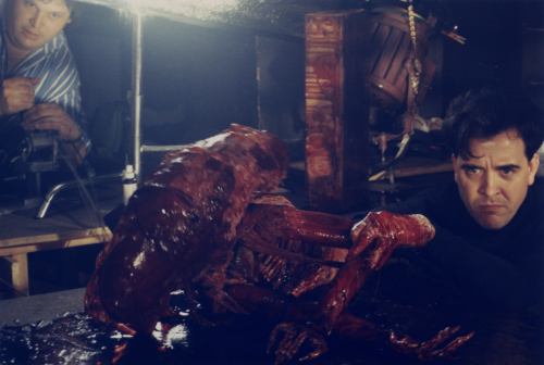 The design of the infant Alien implemented anatomical structures of a quadruped and was strongly influenced by Giger’s earlier attempt at designing this stage of the creature. The ‘Bambi-Burster’, as it was affectionately called by the crew, was gangly and foal-like in proportions. For the bursting sequence, a dummy of the ox was built by Alex Harwood and Monique Brown, and filled with false guts and blood. A simple foam form of the Chestburster was mounted on the end of a ram rod and was pushed through the carcass model (which had been fitted with a hole on its back). Several takes were filmed, but Fincher found none satisfying.