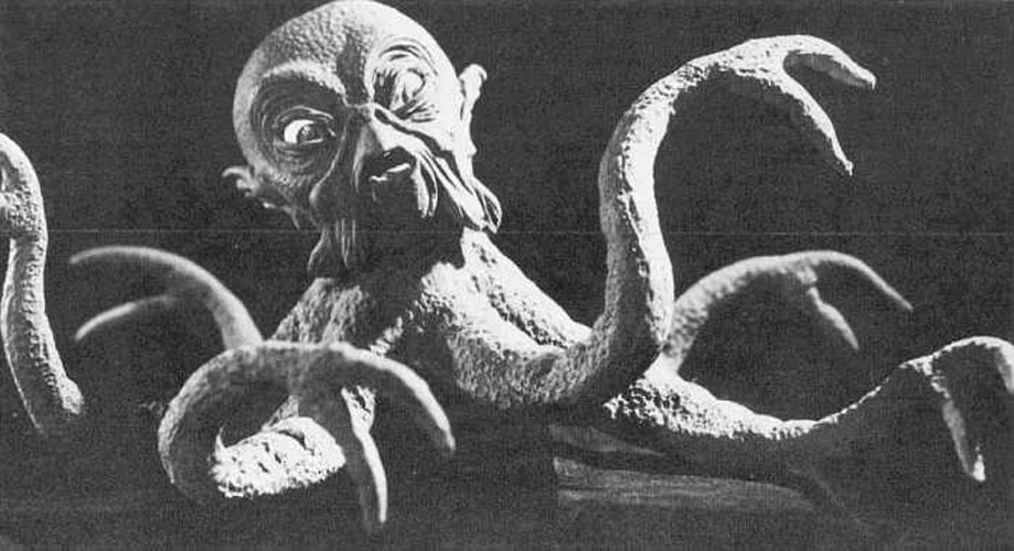 George Pal and director Byron Haskin hired artists Hal Pereira and Albert Nozaki (already Pal’s art director on When Worlds Collide) to conceive the Martians and their war ships. Nozaki was inspired by Wells’s original description of the creatures, but decided to take ample creative liberties — and ultimately conceived an entirely new configuration for the Martians. Ultimately, the film design bears no resemblance to Wells’s original idea. Nozaki envisioned a creature with octopus-like skin and “with a single cyclopean eye” bulging from the center of its head, which was barely distinguishable from the wide torso.