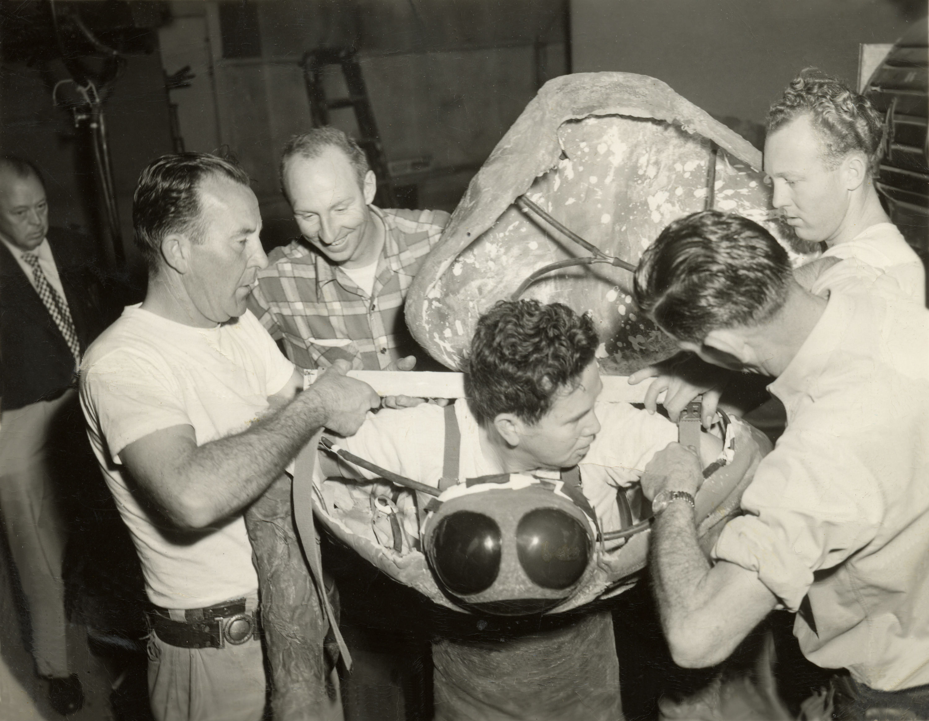 Charles Gemora — veteran gorilla costume maker and make-up artist for films — was hired to construct Nozaki’s design and bring it to the screen. The Martian, seen in the iconic farmhouse scene, was one of the first — if not the first — movie Monsters to be brought to the screen as a performer in a suit. Gemora’s own short stature was providential, as he himself could perform in the elaborate suit.