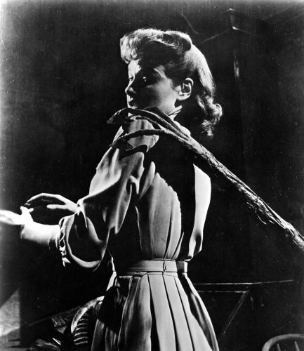 The Martian was painted with “studio blood” and glycerin. Once the suit was completed, it was brought onto the set — it had to be moved very carefully due to its fragility — where Gemora put it on. Once on set, the last touch to the Martian included further paint details and final applications of vaseline to achieve a wet, organic effect — also aided by the foam latex skin, which had not dried yet. At 5’3″, the artist had to kneel in order to fit inside the 4′ tall Martian; in such position, Gemora could not move around the set on his own. The suit was thus mounted on a dolly — and could be moved by two crewmembers through wires. They once pulled so strongly that Gemora risked falling over and thus irremediably destroy the suit — something that ultimately did not happen. During filming, Diana was under the floor of the elevated set, pumping air into the vein bladders — with tubes and empty squeeze bottles.