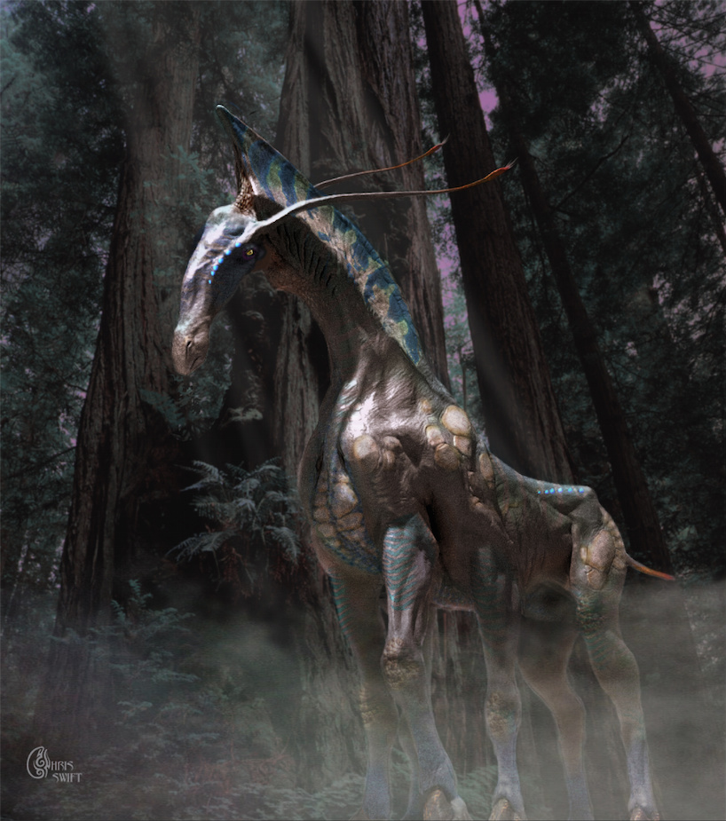 “My influence in the head was clearly a giant anteater,” Wayne Barlowe explained, “but in my drawings I used more abstract lines to deconstruct the familiar mammals’ lines. The mane was a conscious effort to retain the look of a clipped or short mane — an echo of the erect manes on Przewalski’s horses or zebras melded to a cetacean fin – while creating an iconic line. And, the cuticle-like armor simply made sense as an evolutionary answer to moving through potentially dangerous underbrush and ever-present Viperwolves.”