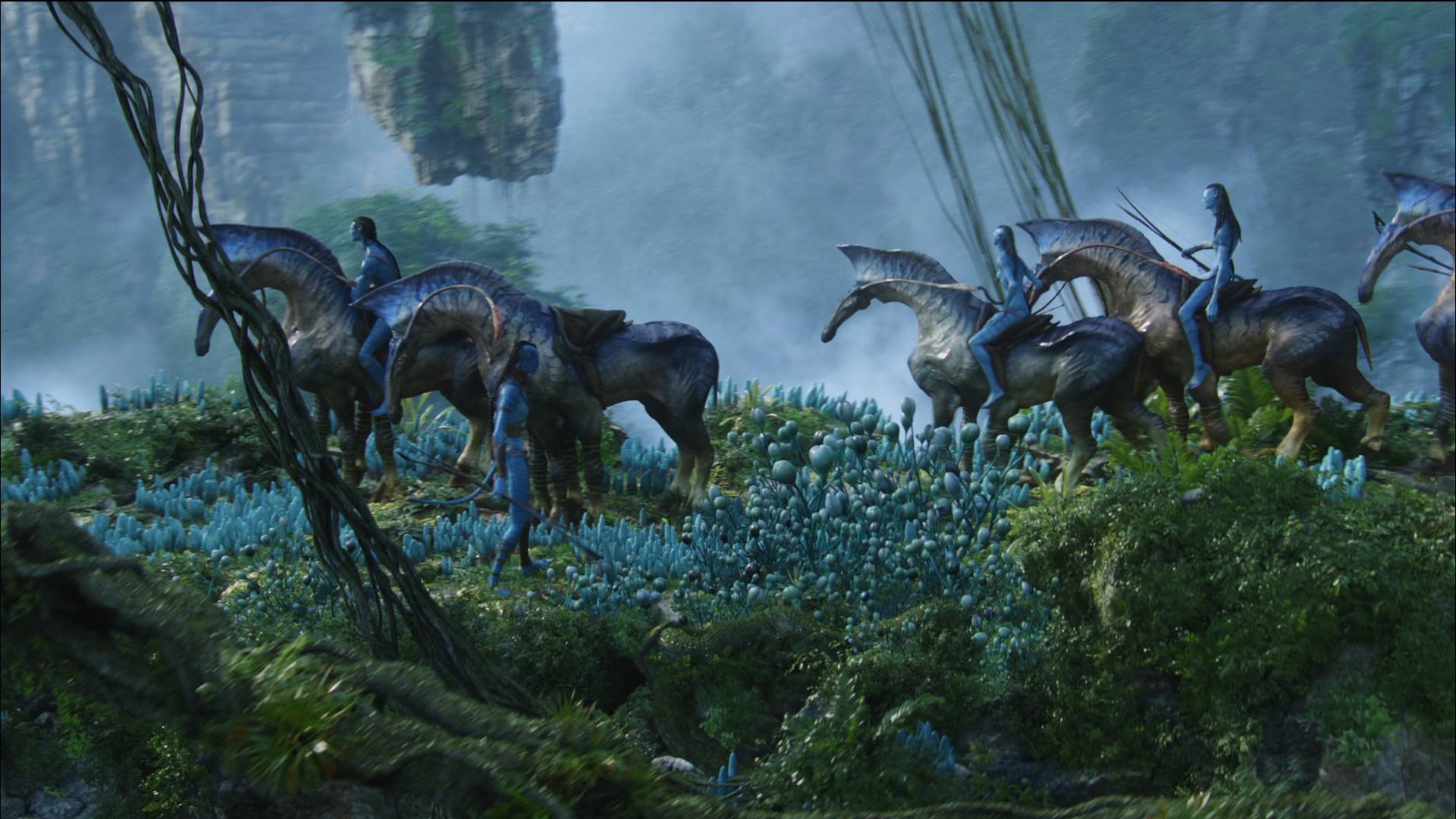 SEVERAL NA’VI RIDERS thunder toward him. They are riding DIREHORSES — six-legged, armor-skinned alien Clydesdales.