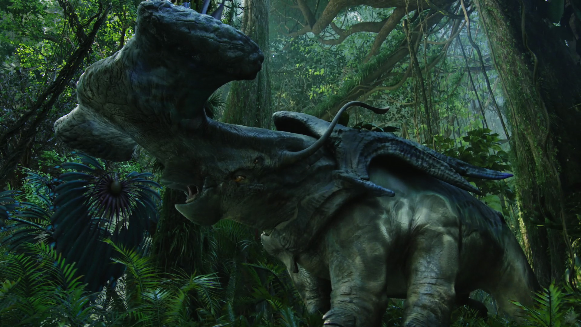 During Jake’s first mission on the planet, he comes accross a herd of Hammerhead Titanotheres (Angtsìk in the Na’vi language), massive armoured herbivores with a characteristic fan-like crest used for display and a bony protrusion on their skulls used to threaten predators and for direct offense.