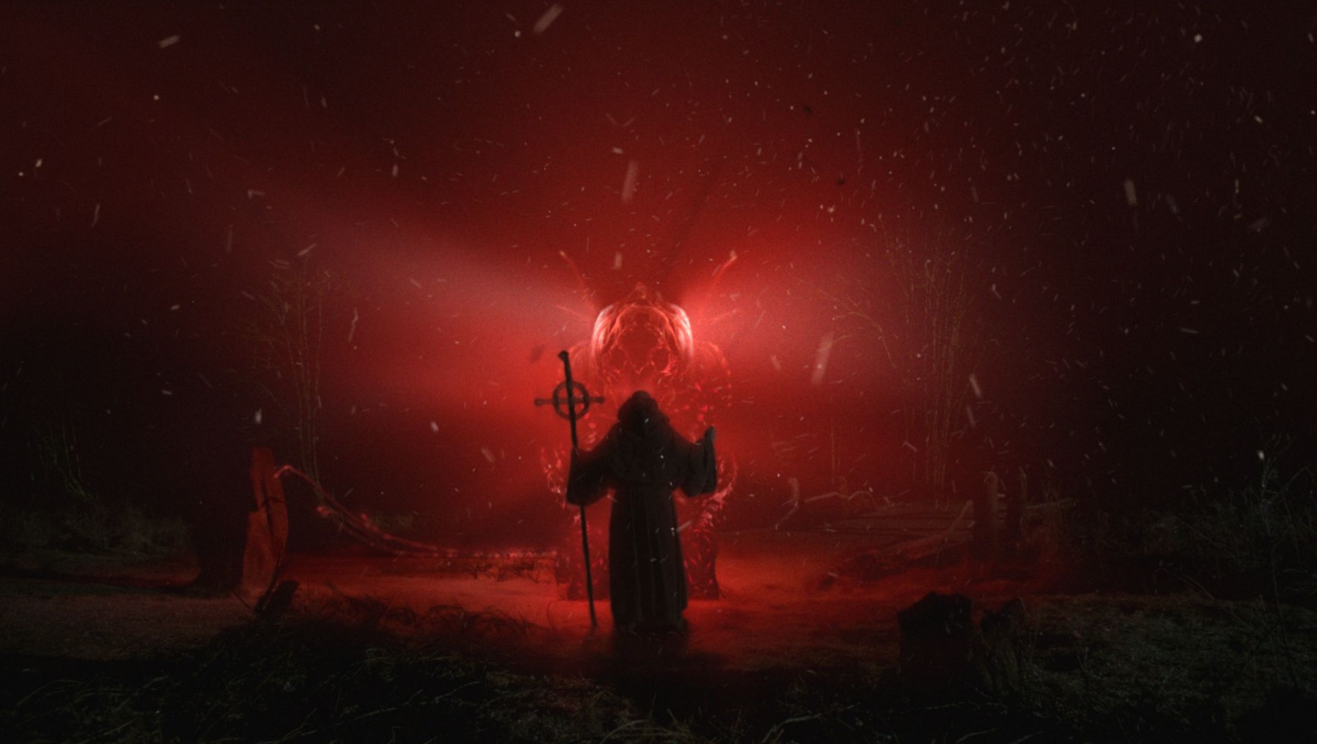 The Moorwen’s blood was one of the limited elements of the creature brought to the screen as both a practical and digital effect. “Howard really wanted it to glow with bioluminescence,” Kuklish said, “which meant we had to find a practical solution that would work even in non-visual effects shots, for instance when the blood would spray onto the actor’s faces. Tony Kenny, our Special Effects Coordinator, ordered up a bunch of different materials for us to look at. We first tried some of the ultraviolet paints and tints. They were non-toxic but quite messy and they also had the disadvantage of needing UV lighting instruments on set, which gave a purplish hue to the lighting. Also, they looked distinctly like pigment; they didn’t really look like ‘glowing’ blood. Finally, we ended up getting a bunch of those safety-light glow-sticks that you break in two and then they glow for a couple of hours. We got a good deal on a big lot of those, mixed a few colors together for our secret mix, and that ended up being our blood. It worked surprisingly well, and a fresh batch glowed bright enough to expose on film with quite a bit of light output.” To portray the Moorwen’s interaction with dirt, water, and fire, a mixture of composited practical elements shot and digital elements was used.