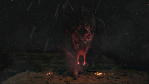 Other details of the Moorwen design included the whip-like tail used in combat and hunt, as well as the peculiar pupil structure. One of the last elements to be modified — ten years after its conception — was the length of the creature’s neck, which was increased in order for the creature to turn its head more easily. The Moorwen design was ultimately finalized in a small-scale maquette, which was painted over digitally to obtain variations of the creature’s colour scheme. The final Moorwen was predominantly gray, with red and flesh-coloured highlights.