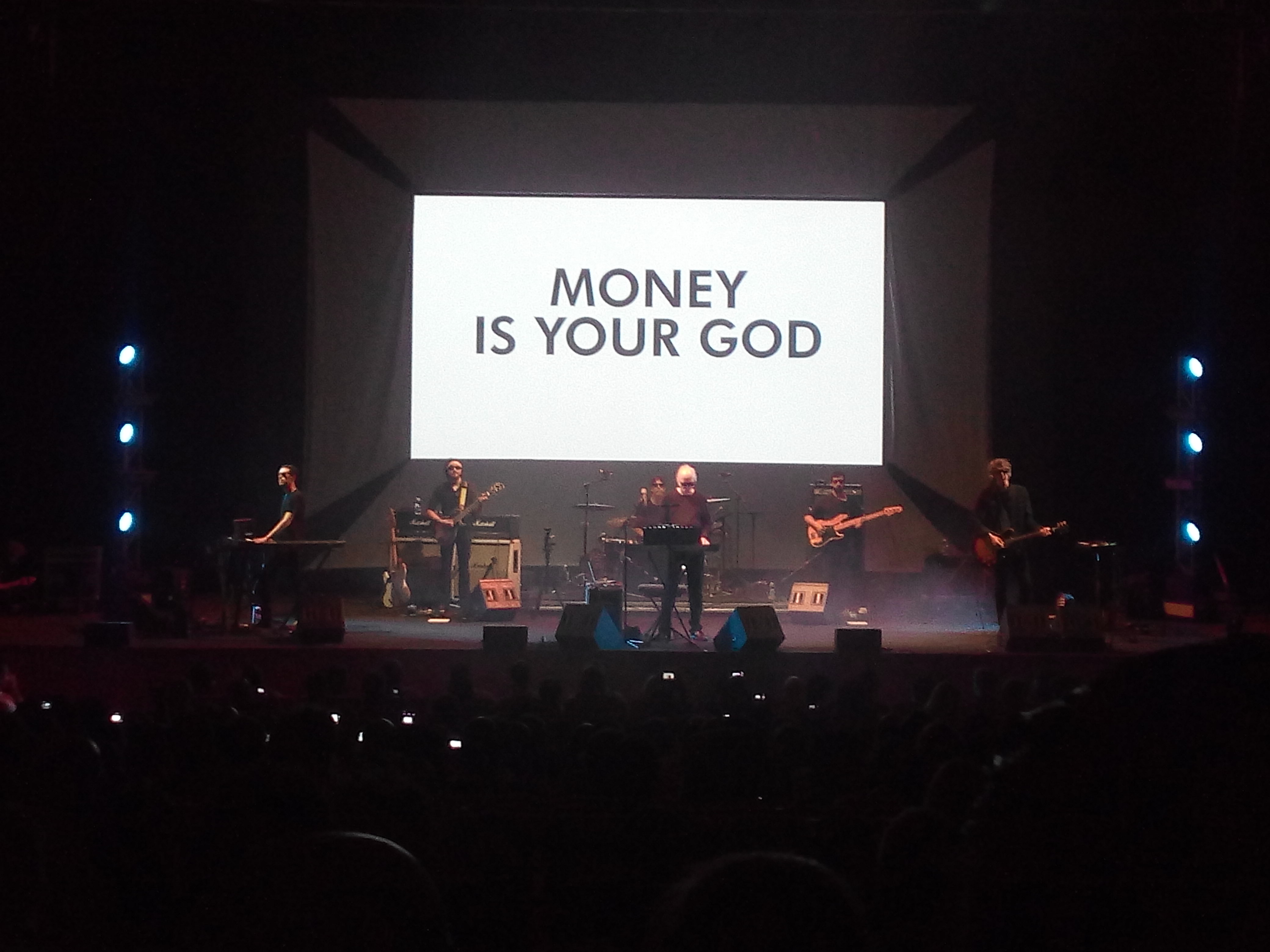 Title cards flash before the audience: “Money is your God”; “Submit”; “Consume”; everyone knows it — it is time for the theme from They Live. For this one performance, Carpenter amusingly puts on the memorable sunglasses that allow the antihero of the film to discover the real world underneath the mundane routine he is used to. Footage of his encounters with the corrupt-faced aliens and the street fight with Keith David are shown.