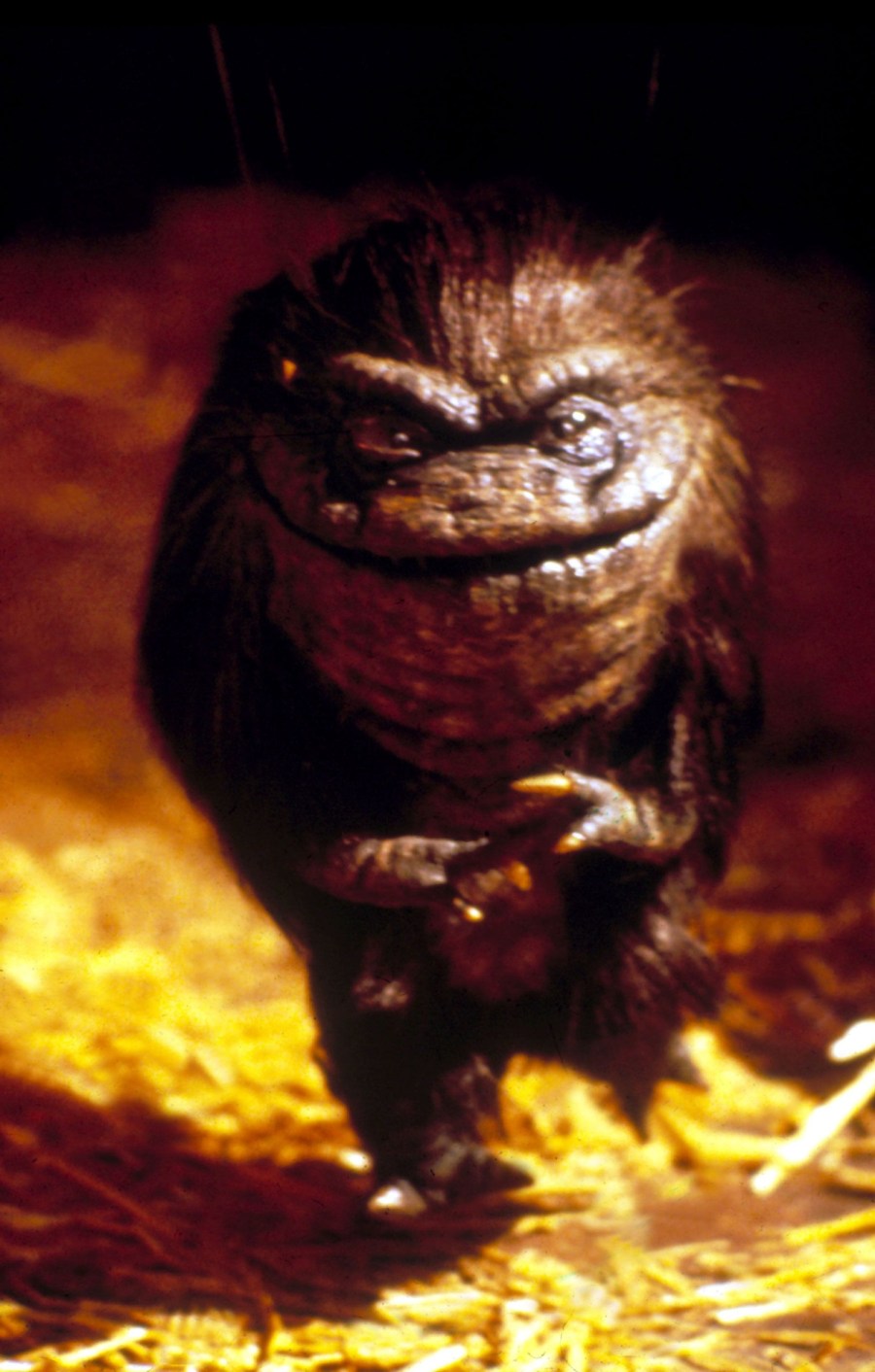 Since most of the puppets did not have functional legs, a special ‘walking’ Critter was also devised with a cable rig and an inner motor operating the rotating legs. The puppet was secured through wires to an overhead dolly. As the puppet’s feet would remain suspended above ground, it had to be filmed at high angles to properly achieve the illusion of it walking about. The same puppet could also be puppeteered from underneath, such as in the barn scene.