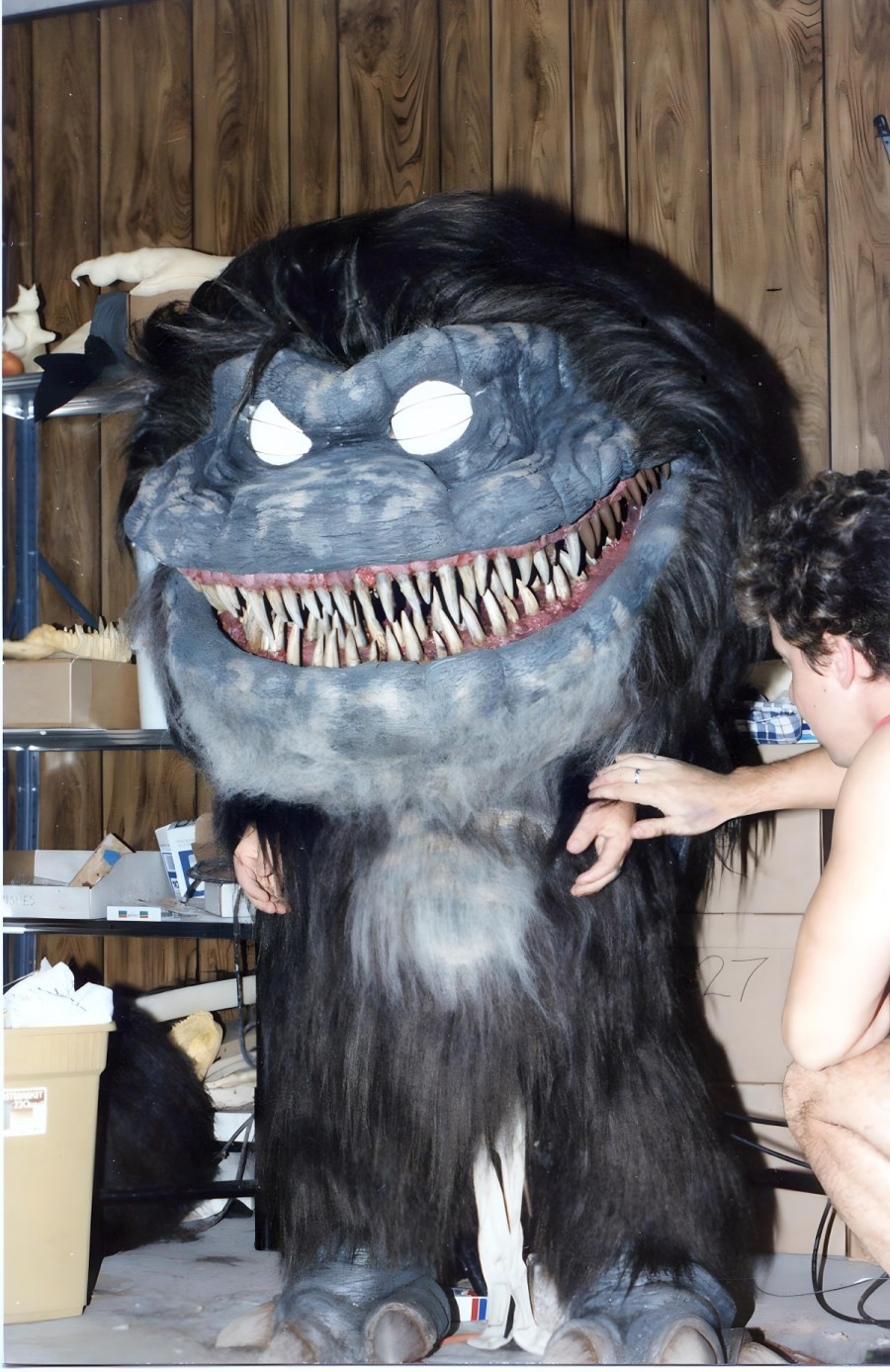 A 4′ tall suit was thus devised to be worn by a little person, with the Chiodo brothers jokingly referring to it as “the Kool-Aid Kid” due to its goofy proportions. When the suit proved too heavy for a little person to operate, stuntman Kevin Thompson was brought in. “The entire weight of the suit was in the mouth apparatus,” he said, “so I actually had to bend backwards to operate the mouth. When I first put it on, I understood why the little person who they first cast fell over wearing the suit, he was so light. So he couldn’t do it and the stunt coordinator was standing right next to him and he looked at the director and he goes, ‘I got a guy.’ I just worked with him on the Ewok movies, like The Battle for Endor and The Ewok Adventure. Now, of course these are the days way before cell phones, so he calls me and I just happened to be home.”