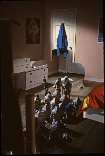 The Minion performers were carefully directed in order to move apart in an appropriate fashion. Cook recalled: “when we were lining up to do the workman breaking up, we were working late at night. I first got them all into a rough positio, and then I went through and told each one to lie down in a way that would approximate a body part. One guy would be the head, two guys would be the shoulders, another two guys would be parts of the arms and so on. They all had to contort themselves into ridiculous position to approximate the outline of the body; and so there was a whole big line of them all crouched down in their positions. These guys had all been told to take care of the suits and be real serious — no fooling around. Well, at one point I was up on the camera platform and Craig was down on the floor attending to the suits, and this one guy was lying down sort of on his back with his legs crossed and one arm up over his head, looking like he was taking a sunbath. Carig walked over to him and jokingly kicked him in the polyurethane butt and said, ‘hey, get up you silly-looking dope.’ Then he heard this muffled voice from inside the mask saying, ‘I can’t move — I’m an arm.'”