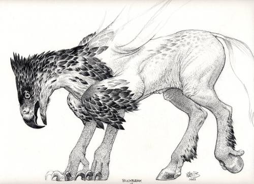Designing Buckbeak was a task that mainly relied on artistic interpretation. Early concept art by Wayne Barlowe featured multiple wings, as well as smaller toes with hooves on the hind legs and other unusual details. This template was channeled by Dermot Power, who was the key artist in the design process — finalizing the design and providing a colour scheme for it. The golden eagle served as the main reference for the Hippogriff’s profile.