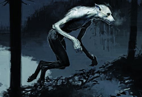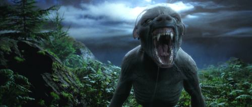 The concept of lycanthropy as a sickness was central to the conception of the Werewolf; Cuarón intended the endow the creature with emotional gravitas and sadness. To that end, creature designer Wayne Barlowe conceived the Monster as a gangly, emaciated creature with distorted proportions — giving it a hunched back, long and thin limbs, and a sickly, almost skeletal head. The Werewolf is also mostly hairless — enhancing the thinness of its form — with sparse coverings of light hair on its body. Barlowe’s renderings were channeled by Rob Bliss and Adam Brockbank, who took over the design and finalized it — making it less hairy and giving it a more skeletal appearance.