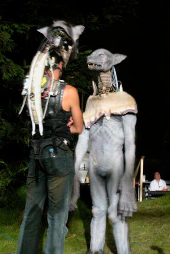 Werewolf suits were constructed to fit two performers — Marnix Van Der Broek (a Belgian ballet dancer) and Spencer Wilding (English kickboxer) — both cast for their tall, muscular and slender bodies. The foam latex suits were skin-tight and featured a neck extension (with eyeholes) ending in a fully animatronic radio-controlled head, as well as arm and leg extensions. When the performer threw his weight forward, he rose up on the stilts, transferring the weight to his shins. The head of the Werewolf was attached to a weight-supporting spine that distributed the weight around the hips and shoulders.