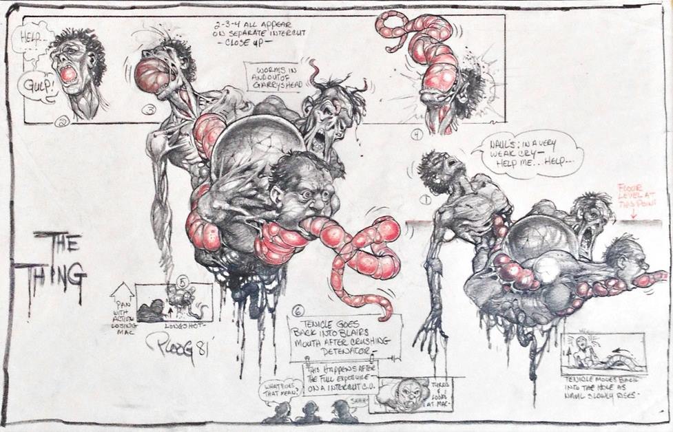 Bottin alone could not work out the necessary concepts in time — and so Carpenter resorted to hiring comic book illustrator and storyboard artist Mike Ploog.”John asked me to draw [the concepts],” Bottin recalled, “but I told him it would take too long, so he suggested I work with one of the storyboard artists, Mike Ploog. When I described my ideas to him, he dropped his coffee cup. But what he came up with was great. We must have gone through a thousand drawings — all good stuff. There was enough for six more movies.”
