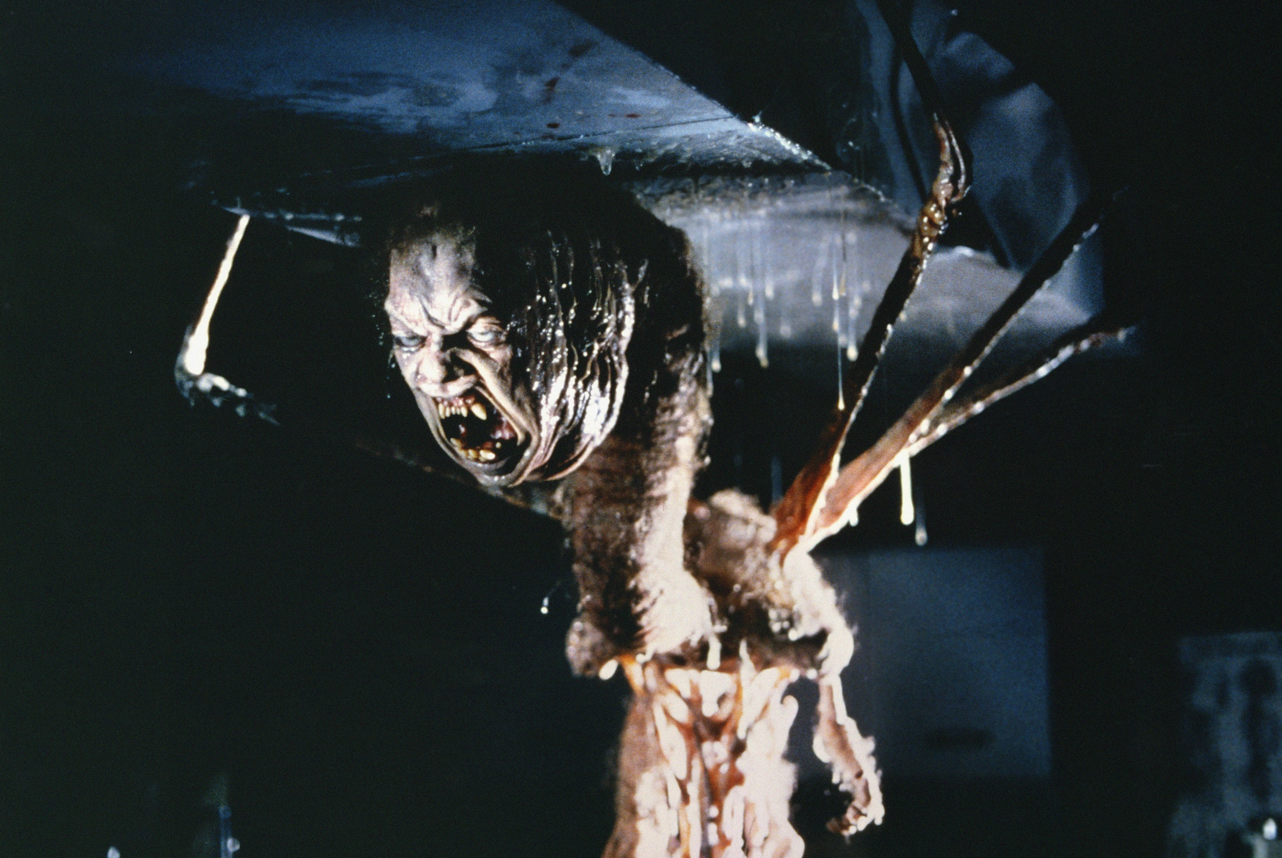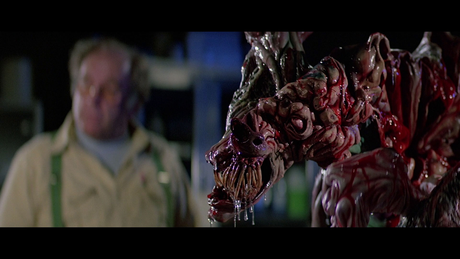 Arguing that excessive gore would drain the viewer’s experience, Bottin also deliberately avoided too much human blood during the transformations. “That’s my cut-off point — the blood. It doesn’t make them scared, it makes them sick,” he explained. “It’s a human violation. Now, if my dog jumped up on me and his face split open and started shooting blood all over, I’d throw up. But if his head turned inside out, and I saw purple and green instead of red — well, dog’s heads just don’t do that. I’d say, ‘now, that’s an alien.'” While blood is indeed present in certain sequences and shots, it is often replaced with alien ichor and ooze of varying colours — from green, to yellow, to purple. “If you had blood spurting all over in some of these scenes,” Bottin related, “I think you’d make people chuck.” Unlike contemporary horror films like The Texas Chainsaw Massacre, Bottin considered the transformations of the Thing “pure, harmless fantasy.”