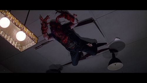 Budget limitations, however, quickly became obvious. “We loved this idea and were dedicated to its execution well after it became impractical — it took a crew of 20 to operate and light the drum, plus the cost of the set, upside down hazard pay for the camera crew,” Cohen continues. “I think because it was a real movie moment, one you seldom get a chance to try. With financial reality finally setting in, we met on the rec room set to map out a less expensive alternative, and what could be cheaper than a stuntman falling into frame and landing on a mattress covered with a thin layer of painted balsa wood? I proudly contributed the foot stomp that motivated Palmer’s leap to the ceiling, and a sequence was born.”