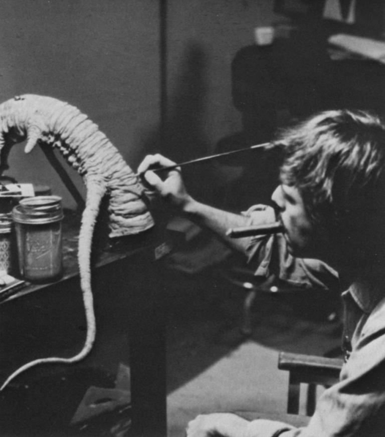 Originally, the Palmer-Thing was built as a puppet of Palmer’s head, which simply split in half — revealing a lunging tentacle. Deemed unconvincing, it was replaced with a transformation portrayed on the screen with progressive stages. Three puppet heads were devised with air bladders and shifting inner forms to portray Palmer’s swelling connotations and eyes — before they eventually explode, revealing a deformed skull underneath. According to Burman, the third puppet head was “a full head and torso puppet that was rigged with tubes to pump in various solvents to make the foam swell and distort.”