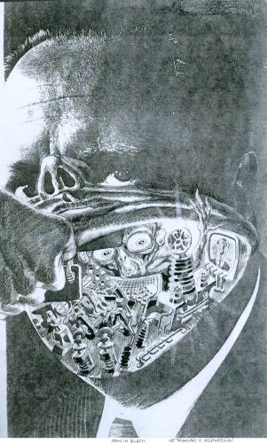 During development, the bar scene was excised — replaced with the worm guys — but the Chucky design and idea was so well-received that Sonnenfeld decided to use it for Mr. Gentle, a character that in the final film became Rosenberg. “They liked the idea so much that they cut out the bar scene altogether and then wrote a completely different scene with the Rosenberg alien,” Setrakian said, “which had dialogue and became this thing where it was revealing one of the plot points of the film.” The alien and cockpit design was further refined by Huante following its new central role in the film. Sonnenfeld was so fond of the initial concept so much he asked for the design to stay close to that configuration.