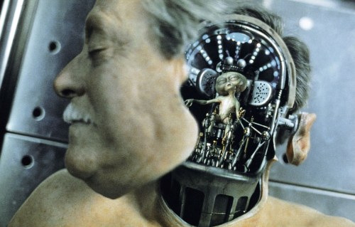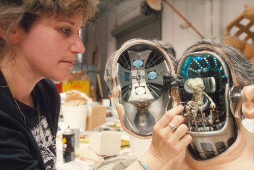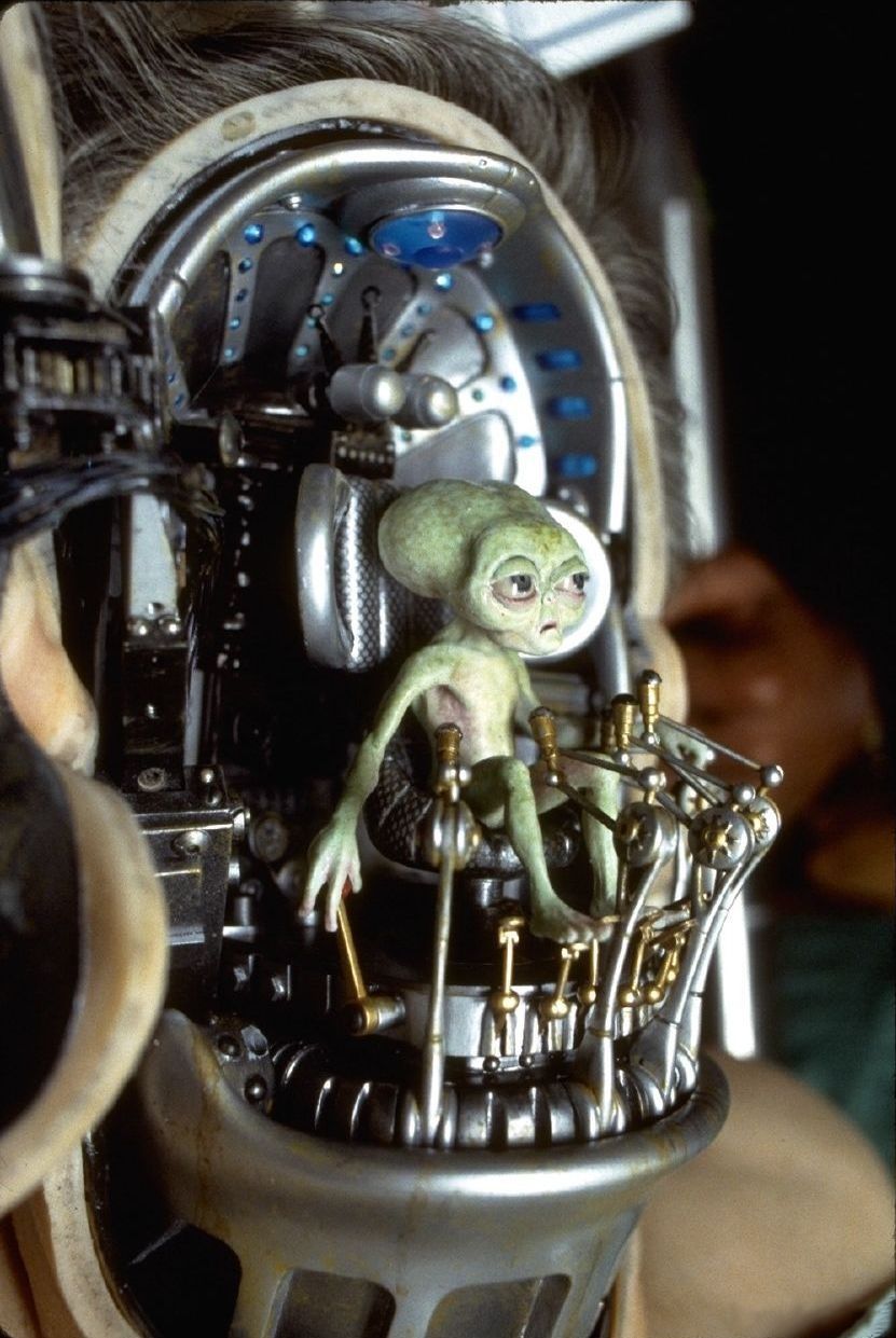 Baker and crew agreed that this sequence was too dialled back and lacked punch. In addition, they noticed similarities with the 1985 film Cocoon — in which the aliens’ real appearance is that of luminous humanoids. Baker assigned crewmembers Jim McPherson and Mark Setrakian the task to concoct a new alien concept for the sequence. “Rick said, ‘that was done in Cocoon. Let’s do something better.’ He said ‘you guys come up with something better for tomorrow morning.’ We were leaving for lunch. Mark and I talked about the alien at lunch and yes, the idea of an alien with foot pedals, levers and monitors was Mark’s idea.” Baker added: “the idea that we came up with was this face that opened up like a door, and there would be a little green man inside working his levers — he would be waving, pull a lever and close it back. Inside he would have little monitors through which he could see [the outside].”