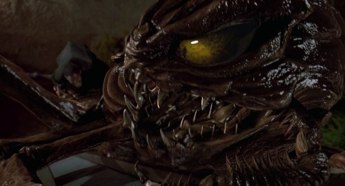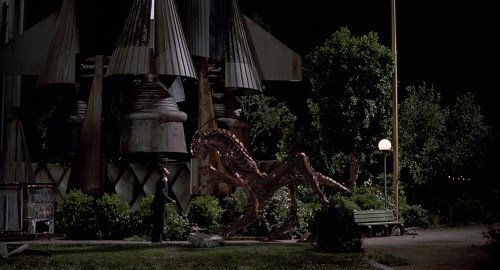 With the intention of retrieving his gun, Kay taunts the creature into swallowing him alive — another physics-defying moment. “Edgar has just come out of a human-sized character,” Brevig said, “and now he has to eat another one alive, without harming him. The secret to getting away with this was that we carefully planned it all out so that the physically awkward moments were hidden in the cutting.” The sequence was shot with the appropriate angles concealing the physical impossibility of the action. The Bug’s insides were silicone and latex filled with fluid.