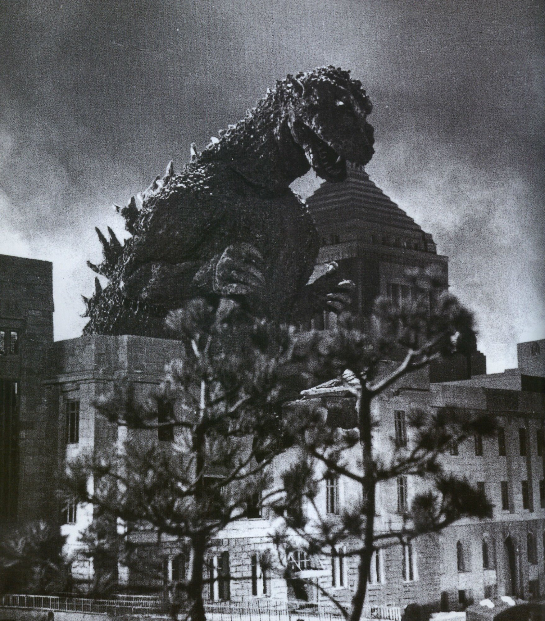 The suit was thus repurposed: it was cut in half and fitted with rope suspenders. Wearing it, Nakajima performed close-ups of Gojira’s legs and tail stomping on the streets. The upper half was instead reserved for certain head shots, such as when Gojira’s head emerges from the water in Tokyo Bay. Full body shots of Godzilla were instead achieved with a second, improved costume — made with a lighter latex that would be easier to maneuver — and slightly altered body proportions. The minimal head movement as well as the tail movement was wire-maneuvered by Kaimai.The suits were filmed in appropriately-scaled miniature sets devised by Tsuburaya and crew, or composited with background plates of the real Tokyo.
