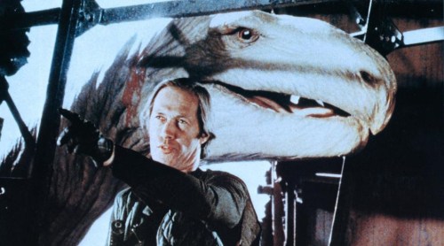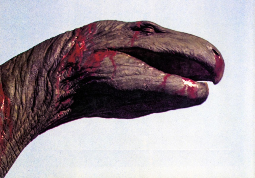 When Allen’s armature was completed, Cook sculpted the final creature directly over the metallic components, and moulded it, with Allen casting the foam latex skin afterwards. Cook and Allen also devised a stop-motion model of the serpent’s head and neck for close-ups. Its armature employed parts from the Caveman Tyrannosaurus skull and other tail and neck pieces.