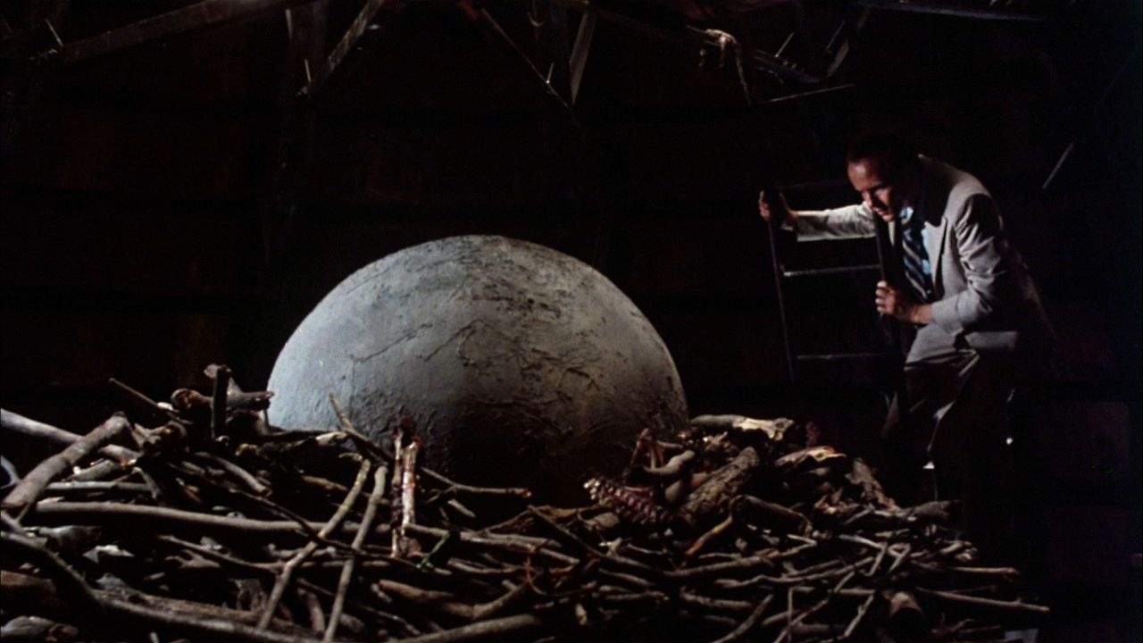 The serpent’s progeny is a newborn creature emerging from a giant egg. The baby was a hand puppet built by Steve Neill, whereas the egg was fabricated by Dennis Gordon. Cook puppeteered the creature from beneath a table. “We actually did one stop-motion shot with the hand puppet,” Allen related. “It’s the only composite scene where you see the baby bird and the people in the same scene. That was done by advancing the projection and having Randy move his hand a bit. We pixilated it and it worked fine. A large bird shell had been built for the live-action, but we just eclipsed it with our model.”