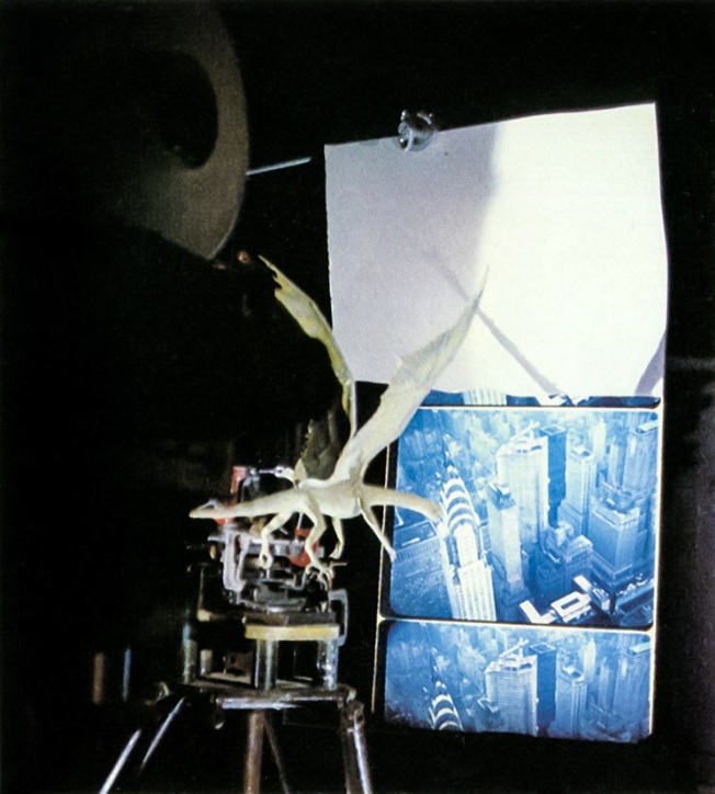 Allen’s approach to the animation of Q flying was at the time unique to the project, and combined elements from multiple traditional techniques. For most of the sequences, the serpent model was rigged on a glass compound through a hinged rod, nuts and washers. The glass was in turn encased in a moving system in front of a process screen. The glass could be moved in all directions in front of the projected background and be animated accordingly. For certain scenes, the puppet was instead suspended on wires — such as when Q crashes on the tower (a miniature matted into the plate).