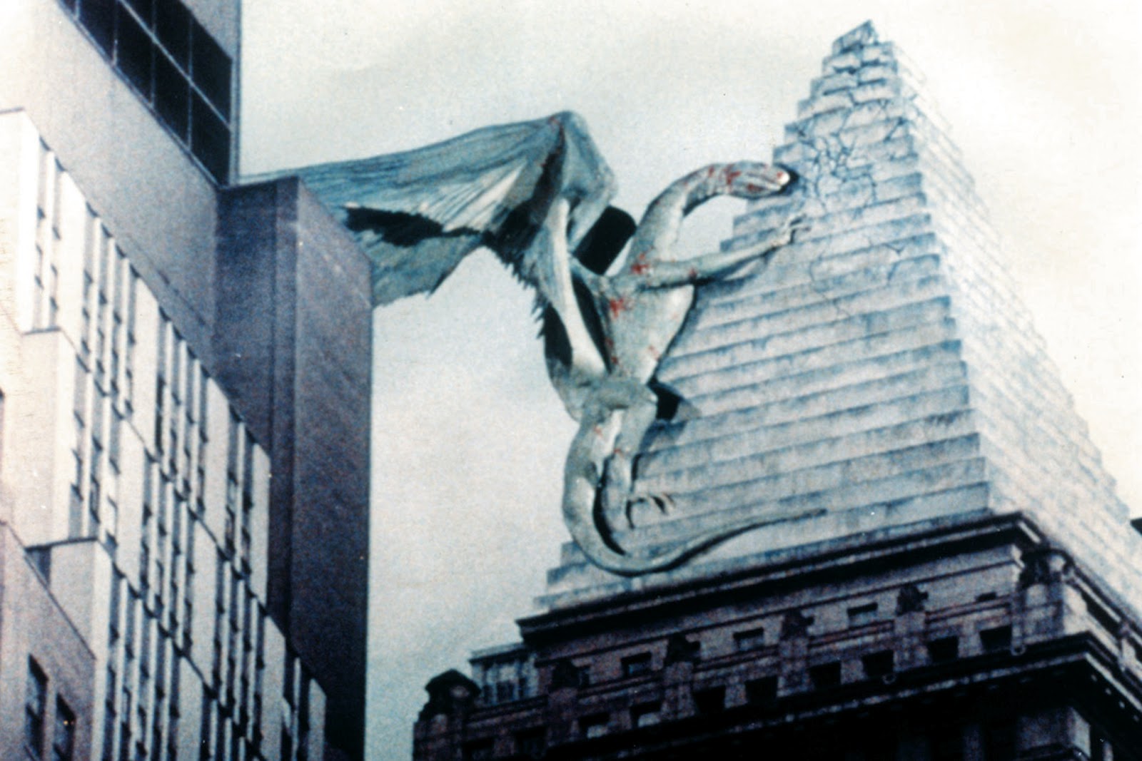 Cohen’s initial plan was to combine point-of-view sequences with full-scale models. He first experimented with red and green optical filters to give the aerial footage a ‘creature-vision’ effect to represent Q’s point of view. Deeming them as too derivative of similar sequences in the 1981 film The Wolfen, Cohen discarded them.