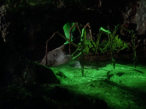 The spider puppet was dubbed ‘the Alaskan King Spider monster’ by the cast of the miniseries. Over 12 feet long and with 15 feet long spiked legs, it featured a fully mechanized head with radio-controlled mechanical components installed by David Kindlon. Inside its body was mouldmaker Brent Baker, puppeteering the creature’s arms — which were devised as a suit extension. The legs were immobile, and the creature could be lowered or raised through an offscreen support. The legs themselves could be detached and used for insert shots.