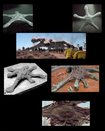 By the time all companies had been assigned their tasks, there were only weeks left to deliver certain shots — and in some cases design work had yet to be completed. St. John recalled: “it took a lot to get the design process up and working in the beginning. We wanted to have all 18 creatures designed and finaled before we started shooting. We did fairly well — we were only short by about four, and one of those was the amoeba-like organism.” This schedule resulted in a compressed design process. Creature iterations evolved even concurrently to the creation of animatics for major sequences; and as principal photography began, some shots were still in the conceptual phase, whereas others were being finished.