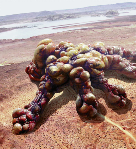 Although the creature was mainly a digital effect, Tippett suggested to build a practical section that could be seen in close-up, interacting directly with the actors for the scene where dr. Block inserts a fire hose into a remarkably sphincter-like opening and injects the amoeba with selenium. KNB devised the full-size practical section based on a Tippett rendering. The section was cable-operated and required 12 puppeteers to maneuver. “The whole thing would flex and pulse like a living thing,” Nicotero said.
