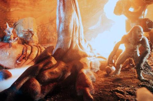 Meanwhile, the original alien habitat has developed further into a full primitive environment, inspired by depictions of Carboniferous forests. It was designed by Michael Riva, who worked in close collaboration with Tippett and the director. Riva then supervised the creation of the cavern environment, a full 360-degree set. The same basic structure was dressed and redressed for three cavern sequences, to portray the development of the alien flora and fauna. St. John explained: “the first time we see the cave it’s very small; then it goes to a kind of Alice in Wonderland sequence, with a cheerful outer-world appearance. The third cavern looks mean and ugly, with everything dark and gloomy, black and sinister.”